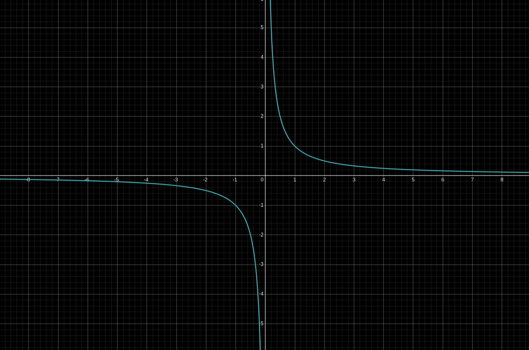 Bu fonksiyonun grafiği sonsuza dek x eksenini de, y eksenini de kesemez, sadece sonsuza dek yaklaşabilir. Bu yüzden \(x=0\) doğrusu bu fonksiyonun dikey asimptotudur. Benzer şekilde \(y=0\) doğrusu bu fonksiyonun yatay asimptotudur